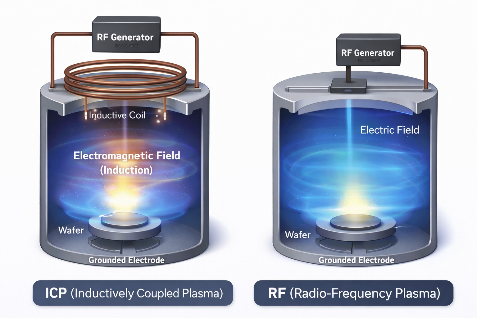 반도체 같은 비교적 정밀성을 요구하는 식각장비를 검토하다 보면 ICP 방식과 CCP 방식이라는 용어를 자연스럽게 접하게 됩니다. 두 방식은 같은 목적을 향하지만, 에너지를 전달하는 구조와 공정 성향에서는 분명한 차이를 보입니다. 이 글에서는 구조적 차이와 운용 관점에서의 특징을 중심으로, 두 방식이 어떤 환경에서 각각 적합한지를 정리하겠습니다.